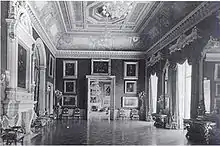 Three other rooms in the house were designed to accommodate Holford's famous art collection. The Grand Saloon (see picture below, left) was frequently mentioned in period publications. It was described by one as "a well-proportioned room. The walls covered with red damask and devoted to pictures. The ceiling a good piece of work of its kind was designed by Mr G. E Fox and executed by Mr Alfred Morgan."[10] The other two rooms. known as the green and red drawing rooms (see pictures below), were described by the same author as follows.