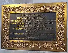 Neligan died at her home in Croydon in 1914,[2] not seeing the result of her efforts, that some women were to get the vote in 1918. Her obituary was published in the Women's Freedom League (WFL) newspaper, The Vote,[9] A wreath was sent to her funeral from the WSPU leader, Emmeline Pankhurst "With love and remembrance for a brave veteran, whose life was spent in noble work for women and for the race,"[4] along with flowers from the local WSPU branch and a wreath from the WFL.[4] A memorial plaque is in Croydon Minster, and at the centenary of (some) women's franchise,[10] the Croydon Central M.P., Sarah Jones had described Neligan as one of the women who offer inspiration to young women of today.[11] And the Croydon Museum project created a banner with her name and the Croydon High School ivy logo image, and the words 'Veteran Suffragette'.[12]