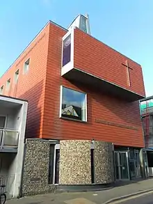 At street level the church protrudes onto the pavement and is constructed of squared cut knapped flint; the upper storeys are constructed in red brick and concrete with large areas of glass and a mostly tiled exterior.[7][3] The interior has many rooms and configurations, and the top floor is partly lit by a glass-faced tower. The design, created by a Worthing-based firm, won a local award in 2003.[5]