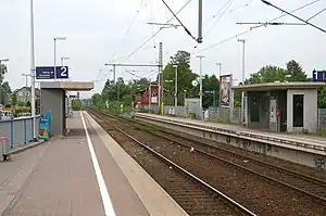 Dortmund-Wickede is a railway station in the Dortmund district of Wickede in the German state of North Rhine-Westphalia. It is classified by Deutsche Bahn as a category 6 station.[1] It was opened on 26 May 1963[4] on the Welver–Sterkrade railway completed between Welver and the old Dortmund Süd (south) station by the Royal Westphalian Railway Company on 15 May 1876 and electrified on 25 May 1984.[5]