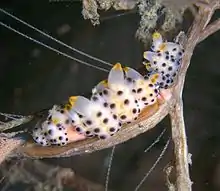 This nudibranch is transparent white with a diffuse, sub-epidermal layer of black pigment which is faint in some specimens and very dense in others. The ceratal tubercles are slightly stalked with globular tips which have a large black spot which is partly obscured by white glands in the terminal tubercle. The digestive gland is usually yellow. The outer half of the rhinophores is black.[5]