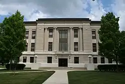 The county's first court session was held in an Illinois Central depot, and later sessions in two different commercial buildings, including one rented by the county recorder.[1]:33 The initial purpose-built courthouse was a small wooden building, which was erected at private expense.[2] Construction began in 1864 on the second courthouse, a two-story brick building with sheriff's house and jail in the basement.[1]:33 O.L. Kinney, the Chicago architect responsible for the design, projected a $15,000 cost, but the final cost amounted to nearly three times that estimate.[1]:34 Further costs appeared on an annual basis, due to numerous problems that required expensive maintenance, and the placement of the jail inside the courthouse was eventually deemed unsafe to use. Consequently, the current courthouse was built in its place over a two-year period, beginning in 1911 and being completed in 1913. A stone Neoclassical structure with a three-part facade featuring Ionic columns in the center, it cost approximately $170,000 to complete.[2]
