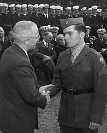 Promoted to corporal in April 1945, he returned to the United States that September, reporting to Headquarters Battalion, Headquarters Marine Corps, Washington, D.C., and was subsequently transferred to the Naval Shipyard, New York, New York, until discharged as a corporal in December 1945. In October 1945, he received the Medal of Honor from President Harry Truman.