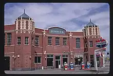 - the two-story brick Dinneen Building with two towers framing a diagonal facade, and