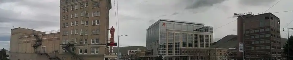 The Higgins and Front area of downtown is considered the center of downtown. It began to grow in the late 19th century and has been growing since. In the early 20th century this part of downtown had electrified streetcars.[8] Its last run in the city was in January 1932.[8] Brick street's were replaced in the 1940s and 1960s.[8] This area has received national recognition for preserving historic properties.[8] Most of Missoula's main downtown buildings in the city are here. They include the Wilma Building, and Wilma Theatre. Others include the Millennium Building, the First Interstate Center, the Florence Hotel, and the newly constructed Garlington Building.