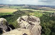 Drábské světničky is a ruin of a 13th-century rock castle in the Czech Republic. It is located about 4 kilometres (2.5 mi) northeast of Mnichovo Hradiště on the ragged edge of a sandstone cliff high above surrounding landscape. The castle covers a group of seven sandstone rocks, connected with wooden bridges. It has been abandoned since the Hussite wars in the 15th century.