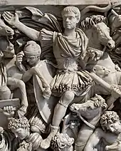 The draco is depicted on the Ludovisi battle sarcophagus, above the horseman who is the central figure in the composition. It appears in several other reliefs, including the Arch of Galerius and the Arch of Constantine, both from the early fourth century.[6] The only fully-preserved copper draco head has been found in Niederbieber.[7]