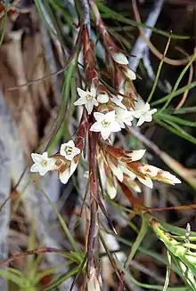 Flowering occurs from January through to March, producing 3–9 white flowers on each 13–28 mm (0.51–1.10 in) long rectangular raceme. The flowers themselves are made up of 4–6 by 1.5–3.0 mm (0.16–0.24 by 0.06–0.12 in) green sepals which enclose a 5.5–6.5 by 2.0–2.5 white hairless corolla. In the upper third of the corolla tube is the stamen, which is made up of a 0.1 mm long light yellow anther suspended off of a 0.5 mm long filament. In order to provide an incentive for pollination D. ophioliticum has 1.0–1.2 by 0.6–0.7 mm rectangular nectary scales.[2][3]