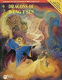 Dragons of Weng T'senis a scenario for character levels 6-9 with an Oriental setting. Violent storms and terrible monsters have been issuing from the forbidden valley of a powerful wizard; the heroes are hired to enter the valley and put a stop to them.[1]
