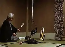 In awkward bone sandals, both Guests make their way to the traditionally-appointed tea room. They wait together in silence in the ante-chamber, a niche in the corridor, whilst the workers examine the ambergris on deck and the Host prepares his organically-fashioned instruments for the tea ceremony. The sliding door to the tea room is pulled ajar and the two Guests look searchingly at each other to decide how to proceed. The Male Guest kneels at the door first, places his shoes outside the room and enters in the agonisingly slow ritual style of placing his fan one pace ahead to where he will shuffle forward, in his restrictive ceremonial garb, acknowledging the tokonoma alcove before he reaches his place in front of the host. The Female Guest enters and repeats the process. The Host enters and the Guests thank him for his invitation - the Male Guest in English and the Female Guest in Icelandic, the actors' native languages. The tea ceremony is enacted and the Host describes the history of the Nisshin Maru vessel as the crew carve the excised part of the field sculpture into solid blocks and render them in the ship's furnace. The plastic 'spine' from the excised part is lowered into the ship's hold.