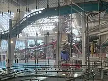 DreamWorks Water Park occupies six stories adjacent to Nickelodeon Universe American Dream.[22] According to the mall's organizers, DreamWorks Water Park is the largest indoor water park in the United States, at 8.5 acres (3.4 ha).[12][23][lower-alpha 1] Specific areas include an area themed around Shrek's Soggy Swamp, a Kung Fu Panda-themed children's play area called the Kung Fu Panda Zone, and a Madagascar-themed tower called Madagascar Rain Forest with 15 water slides.[12][25] All of the park's water slides were exclusively developed by ProSlide Technology, a Canadian company.[26][27][28] Inside is a 1.5-acre (0.61 ha), 1,500,000-U.S.-gallon (5,700,000 L) indoor wave pool and a lazy river which runs through Shrek-themed scenery.[12][25][4] DreamWorks Water Park also contains a set of dueling slides, the world's second-tallest body slides, starting from a height of 142 feet (43 m) and featuring a 50-foot (15 m) free fall.[4][26][27] Another attraction is a 1,600-foot-long (490 m) "hydro-magnetic roller coaster called Toothless Trickling Torpedo" and a Proslide KrakenRACER mat racer slide called Dragon Racers. Dragon Racers and Toothless Trickeling Torpedo are the only rides in the water park that are themed towards the How to Train Your Dragon franchise.[4][26][27][29]