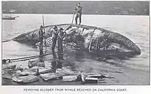 A whale's massive carcass would provide a coastal community with considerable amounts of meat and fat, without the danger and effort of venturing onto the open ocean to harpoon a living leviathan.[21] An additional resource, in the treeless Arctic, was the long bones, useful for construction. An even more specialised benefit is the occasional presence of ambergris in the guts of sperm whales; in 2021 a group of Yemeni fishermen sold their find for $1.5 million.[22] Blubber used to be processed into whale oil.[1] More generally, whale meat is still valued in some countries; muktuk (skin and blubber) is eaten uncooked as a delicacy in the Arctic, as fat is especially welcome in very cold climates.