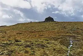 Drygarn Fawr is a mountain in the county of Powys, Wales. It is one of the highest summits in Mid Wales at 645 metres (2,116 ft) above sea level. It lies to the south of the Elan Valley Reservoirs. Rising above the remote moorland plateau of the Cambrian Mountains, and to the west of the peaks of Radnor Forest, the summit is topped by two distinctive, large cairns. The mountain has a gentle, grassy, conical shape with a few rocks near the summit. Nearby are the summits of Gorllwyn, Y Gamriw, and Drum yr Eira all over 600m.