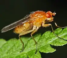 The Dryomyzidae are a small family of flies ranging from 4–18 mm long, with prominent bristles, and yellow to brown or rust-yellow coloring. The wings are very large. The subcosta is complete and well separated from vein 1. Larvae feed on decaying organic matter - carrion, dung, and fungi.[3] The prelambrum protrudes from the oral cavity. Vibrissae are absent and the postvertical bristles are divergent.[4]
