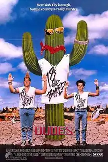 Reviewing the film from a VHS copy in 2005, film critic Emanuel Levy rated it a 2 out of a possible 5.[14] Writing for Not Coming to a Theater Near You in 2011, Victoria Large called it "something of a bridge between the cult, punk films that started [Spheeris'] career and the slick Hollywood comedies that the director is perhaps more widely associated with. And while it’s true that melding the spiky strangeness of Suburbia with the agreeable silliness of Wayne’s World makes for an uneven viewing experience, Dudes is also a fun watch."[15] Placing it in the "punk western" subgenre alongside other 1987 films Straight to Hell and Border Radio, she remarked that Dudes is "most memorable for its loopy flourishes" and "at its most self-conscious when it comes to its co-option of western tropes", concluding that "while Dudes takes pains to reclaim the western for its spiky-haired leads, therefore placing it in conversation with past westerns and with other countercultural films [...] I'm not sure that it adds that much to the discussion, or even that it means to. But its utter weirdness is a virtue, and there's a playfulness here that charms."[15] In 2015, critic Dennis Schwartz gave the film a B− rating, calling it an "off-beat road adventure comedy" that "has some Easy Rider vibes going for it", concluding that "the violent clash between cultures makes for absurdist adolescent drama, but it's weirdly entertaining."[16]
