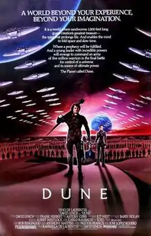 The film opened on December 14, 1984, in 915 theaters, and earned US$6,025,091 in its opening weekend, ranking number two in the domestic box office behind Beverly Hills Cop.[25] By the end of its run, Dune had grossed $30,925,690 (equivalent to $87,000,000 in 2022).[2] On an estimated production budget of $40–42 million, the film was considered a box-office disappointment.[26] The film later had more success, and has been called the "Heaven's Gate of science fiction".[27]