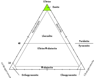 Dunite (/ˈduːnaɪt, ˈdʌnaɪt/), also known as olivinite (not to be confused with the mineral olivenite), is an intrusive igneous rock of ultramafic composition and with phaneritic (coarse-grained) texture. The mineral assemblage is greater than 90% olivine, with minor amounts of other minerals such as pyroxene, chromite, magnetite, and pyrope. Dunite is the olivine-rich endmember of the peridotite group of mantle-derived rocks.