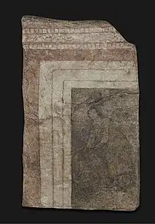 Only the baptistry was decorated with wall paintings, which distinguished the church from the nearby Jewish synagogue that featured artwork on display throughout. Scholars hypothesize that this difference stems from Christianity's desire to promote conversion at the time, which would only happen within the baptistry and give the convert the singular experience of witnessing the artworks when they were anointed.[35] The room's ceiling could be reconstructed using plaster fragments; it was painted in dark blue with bright stars.[36] The baptismal font was on the west side of the room, where there were a brick canopy with a vaulted ceiling and two pillars in the front. The pillars were painted dark green with black veins, probably to imitate marble. The front over the arch of the niche showed fruits in fields. The ceiling inside the niche was blue with bright stars.[37] Inside the niche was the baptismal pool. There are paintings on the back wall; the Good Shepherd was on the left[38] with a ram on his shoulders. The figure was about 40 cm (16 in) high. A flock of sheep was depicted in front of him, in the middle of the field and on the right. The number of sheep and rams cannot be determined today; it was probably once between thirteen and sixteen. The sheep on the far right are drinking water, although this part of the scene was in poor condition. The large number of sheep was atypical for comparable presentations. Under the Shepherd are Adam and Eve; both figures appearing to be a later addition. The whole picture was found to be poorly preserved and was found in fragments that had to be reassembled. It is uncertain whether the number of sheep had a symbolic meaning. The representation of the Good Shepherd was extremely popular in ancient times; it is always a picture of a young, beardless man in a short skirt carrying a sheep on his back.[39]