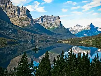 ![]() Dusty Star Mountain is in center of image, above and slightly left of Wild Goose Island in Saint Mary Lake | |