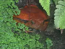 Females are much larger than males, reaching up to 10.5 cm and 230 g in weight (6.5 cm and 41 g for males).[3] Tomato frogs live up to their name by possessing a vibrant, orange-red colour.[4] Females have brighter tones of red or orange on their back, with a pale undersurface.[5] Some individuals also have black spots on the throat.[4] It is thought that the brilliant colours of the tomato frog act as a warning to potential predators that these frogs are toxic;[6] a white substance secreted from the skin acts as a glue to deter predators (such as colubrid snakes) and can produce an allergic reaction in humans.[4][5]