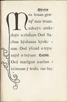 Page 1 from J. G. Evans' edition (1907) of the Black Book of Carmarthen, being the 'Ymddiddan' (dialogue) between Myrddin (Merlin) and Taliesin.