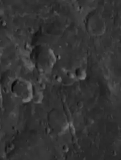 ![]() Oblique Apollo 16 mapping camera image Dziewulski crater is at top, Catena Dziewulski is linear feature at lower left | |