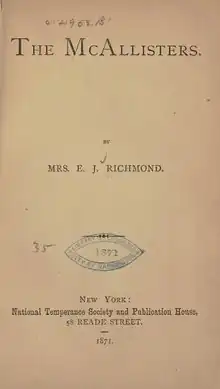 Since childhood, Richmond was interested in temperance work, and one of her early stories, The McAllisters, was a temperance[4] history based on the lives of persons known to her. The National Temperance Publication Society published that book, with her full name attached, paying for the manuscript. The book was very successful.[2]