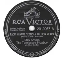 "Each Minute Seems a Million Years" is a country music song written by Alton "Cook" Watson and sung by Eddy Arnold, billed as "Eddy Arnold, The Tennessee Plowboy and His Guitar". It was released in 1945 on the RCA Victor label (catalog no. 20-2067-A) with "You Must Walk the Line" as the "B" side.[3] In debuted on the Billboard folk chart on June 30, 1945 and peaked at No. 5.[4] It was Arnold's first of 128 hit singles for Arnold.[4][5]