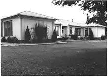 The building sits at the southeast corner of Main and Second Streets.[3]: 15 Originally, the building included 6 classrooms, 4 offices (principal's, secretary's, attendance, and main), and 2 restrooms.[3]: 16 The central façade is flanked by two small wings, which protrude slightly towards Main Street, forming a small "C" shape. The foundation and walls are brick, which has since been stuccoed over. The windows were double-hung, three-over-three wood construction, in vertical proportion in groups of two to four with common sills. These have been replaced by aluminum windows, one-over-one single hung inserted into the original sash frames. Doors were originally "wooden, single- light doors with multi-light transoms overhead", with most now replaced by modern units. Broad stairs led to the main entries in the front, back, and both sides, although the stairs on the south side were destroyed with the construction of the cafeteria addition. There are also several smaller sets of steps leading to the outside from minor entrances. The entrances are framed by pedimented parapets, which sit on pilasters. The roof has a low pitch with wide overhangs, and is covered with asbestos tiles in a diamond pattern.[3]: 5–6
