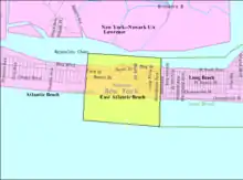 East Atlantic Beach is located at 40°35′17″N 73°42′21″W / 40.58806°N 73.70583°W / 40.58806; -73.70583 (40.588004, -73.705925).[2] The hamlet is one of five municipalities located on Long Beach Barrier Island, a barrier island lying just south of Long Island. It is surrounded by the Atlantic Ocean to the south, Reynolds Channel on the north, the village of Atlantic Beach to the west, and the city of Long Beach to the east.