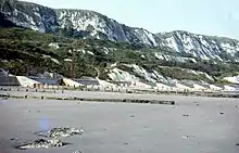 On the east cliffs, are three Martello Towers. These were built on the cliffs in 1804-09 to protect against the French invasion of Napoleon. Number 3, since 1990 is used as a Martello Tower visitor centre by Folkestone and Hythe Council.[1] Beside it is an information panel describing the Roman villa ruins on the site.[2] In 1875 until 1892, near Martello Tower 1, was a public house called the Warren Inn. It was closed after people were caught drinking after hours. The Earl of Radnor had it closed, as it was on his land.[3] The east cliffs were popular with Victorians who picnicked on the grassy meadows of the cliffs before heading down towards the sandy beaches. The area was popular with burrowing rabbits and was named informally 'The Warren'.
