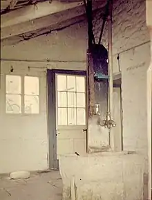 Day and night, the rams thumped every 20 seconds or so and were audible throughout East Dundry until the 1950s.[7] Walnut Farm ran their ram well into the mid sixties with the ram feed water supply coming from an open-topped limestone cistern built into the south side of the valley containing approximately 12 cubic metres of water bubbling up from an underground spring. The ram was housed in a small shed 40 metres into the base of the valley next to the stream with the waste wash from the ram flowing into it. The delivery pipe from the ram ran north up to a holding tank at the farm. Once a mains water supply was installed (1957/8) the water from the ram was used solely for livestock and washing down the yards. The rhythmic thumping of the ram had a shorter frequency than the one mentioned at North Hill Farm with gentle knocks about every 3 to 4 seconds.