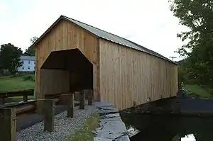 The East Fairfield Covered Bridge is located at the western end of East Fairfield village, on Bridge Street a short way south of Vermont Route 36. It spans Black Creek, a tributary of the Missisquoi River, in a roughly northeast-southwest orientation. It is a Queen post truss structure, 68 feet (21 m) long and 16.5 feet (5.0 m) wide, with a roadway width of 13 feet (4.0 m) (one lane). It rests on abutments of dry laid stone, which have been further finished in concrete and mortar. The trusses include vertical iron roads, and are joined by a web of iron rods above to increase lateral stability. The road deck consists of planking laid perpendicular to the trusses. The exterior is finished in vertical board siding, which extends a short way inside the portals. The bridge was built about 1865; its builder is not known.[2]