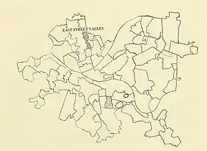 East Street Valley was a neighborhood on Pittsburgh's North Side that stretched northward along the historic path of Butcher's Run, once home to residences, shops, industries, and civic and religious institutions. The neighborhood was demolished prior to the construction of Parkway North, causing the displacement of hundreds of residents over several decades.