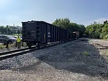In 2003, the last train left Elizabethton, TN and in 2009 the line was formally abandoned and railbanked.[1] The rails and ties were removed in 2012 to make way for a rail-trail.[2] The East Tennessee Railway still services customers around the yard in Johnson City and still makes deliveries to the CSXT and NS. ETRY started out with a two-man crew for many years, and have just now upped to a three-man crew. Operations are Monday through Friday. It can hold up to 286,000 pounds of supplies. [3]
