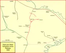 Continuously short of money for construction purposes, the E&WYUR approached the GNR in February 1892, asking it to take it over. The GNR board was willing to consider this, but was cautious about the financial commitment it would be making, and referred the matter to a sub-committee.[4] The issue became complicated: at this time Hunslet had become a major industrial and commercial growth area, and business interests put forward a new line to the north of the E&WYUR, from Beeston to Hunslet; this group approached the GNR for support. At the same time the E&WYUR proposed an extension of its own line to Hunslet, which was to be called the South Leeds Junction Railway. The GNR considered its position on these conflicting proposals, and decided that the line from Beeston would be better, being more direct and involving less property demolition. That line became the Hunslet Railway, opened in 1899 by the Great Northern Railway.[7][4] In May 1892, takeover negotiations between the GNR and the E&WYUR broke down, as the E&WYUR wanted 4% on its share capital, a demand the GNR would not meet.[8] The Beeston to Hunslet scheme proceeded separately, and had no further connection with the E&WYUR.[9][4]
