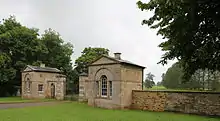 The south entrance lodges to Easton Neston on the Old Towcester Road, with the estate and the tree-lined River Tove visible in the background
