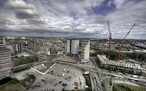The first part of the plan to be implemented was the demolition of a large elevated road junction called Masshouse Circus and the Inner Ring Road to clear land for development. This was part of a larger plan to remove sections of the Inner Ring Road. Masshouse Circus had restricted development out of the east of the city due to its proximity and size resulting in it receiving the name "concrete collar". A bid for money from the European Regional Development Fund was successful and this allowed the demolition of Masshouse Circus possible.[1] This area is now being developed with the construction of highrise apartment and office blocks with one block complete[2] and another under construction. Other buildings completed in the area include the New Technology Institute, completed in 2006, and also the refurbishment of Island House into a base for a redevelopment company. Matthew Boulton College also built a new major facility in 2005[3] and overlooks the Masshouse site. Both Matthew Boulton College and the New Technology Institute were the first buildings to be built on what will be the Learning and Leisure Zone. Developments on the established Aston University campus included a new Academy of Life Sciences, a 22m extension to Aston Business School and a 215 million student residences project on campus. These developments maintained green spaces, trees and water features on campus.