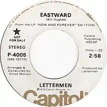 "Eastward" is a song written by Billie Hughes originally recorded in 1971 by Hughes' band Lazarus on their eponymous Lazarus album. American male pop vocal trio The Lettermen covered the song and released it as a single from the Lettermen album Now and Forever in 1974 on Capitol Records.[1][2] The song was produced by the Lettermen and arranged and conducted by Vince Morton. It peaked at #16 on the Adult Contemporary Billboard chart.[3] It was considered a notable Lettermen single.[4]