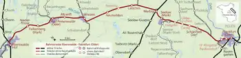 Stations were construction between Bad Freienwalde and Frankfurt on the line in Wriezen, Letschin, Neutrebbin, Letschin, Seelow and Schönfließ. In July 1880, a two-level interchange station was opened at Werbig at the intersection with the Eastern Railway to Berlin and a station was opened in Alt-Ranft. In May 1881, stations were opened in Booßen and Dolgelin and, in 1882, a connecting curve to the Eastern Railway was opened in Werbig for freight. A station was also built in Sietzing in this period. Carzig station was established later and Libbenichen station was built in the 1930s.[2]