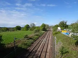 Trains pass at speed on the electrified West Coast Main Line. The station has been demolished, however part of one of the platforms survives.