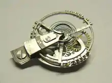 In the period 1808-1822 almost all watches using the échappement naturel were constructed on 4-minute tourbillon carriages, with 12+3 escape teeth, reversed fusees and sprung detent locking and were made to a similar pattern. The watches were large, typically 60-65mm in diameter and a distinguishing feature was their dials. These nearly all had a short hour hand indicating on a small central chapter ring and a large minute hand with a minute ring at the edge of the dial, see watches 1187 and 1188 in Daniels.[1] It is possible that the low price for the watch for the Bishop of Cambrai was because of their personal friendship. Judging by the rather modest mark-up of ~25% that Breguet applied to his workshop costs for other watches with this escapement, he might even have made a loss in this case. Breguet sold the Bishop another tourbillon watch, number 2436, for the same price but this one had a constant force escapement. During the period in which these watches were being sold (1808–1821), a few dozen tourbillon watches were being produced, about half with a lever escapement on a 1-minute carriage and the rest with a variety of escapements, a detent escapement on a 6-minute or 4-minute carriage, a couple with a constant force escapement and at least one with a Robin escapement. The sale of watches with tourbillon movements ceased after Breguet's death in 1823.