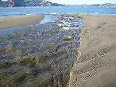 Mixing is important at the landward edge of gravitational circulation, often around X2, where the water column becomes less stratified.[13] A fixed mixing zone occurs at the "Benicia Bump" at the east end of the Carquinez Strait, where the deep channel becomes dramatically shallower as it enters Suisun Bay.[14] Mixing is critical in maintaining salinity such that extremely large inputs of fresh water are required to move X2 a short distance to the west. Mixing also assists pelagic organisms in maintaining position in the estuary,[1] slowing the advection of primary and secondary production out of the system.