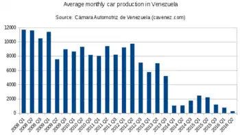 In May 2014, the Central Bank of Venezuela announced that the shortage rate of automobiles was at 100%.[54] Automobiles manufacturers in Venezuela, such as Ford, General Motors and Toyota decreased or in some cases ceased production entirely.[55][56][57][58] In January 2015, Maduro revived the use of transportation tolls in the country for more revenue despite the removal by Chavez, who stated the tolls did not help pay to maintain roads and were part of a capitalist system.[59]