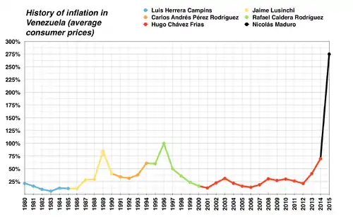 When elected in 2013, Nicolás Maduro continued the majority of existing economic policies of his predecessor Hugo Chávez. When entering the presidency, President Maduro's Venezuela faced a high inflation rate and large shortages of goods[1][2][3] that was left over from the previous policies of President Chávez.[4][5][6][7] These economic difficulties that Venezuela was facing were one of the main reasons of the current protests in Venezuela.[8] President Maduro has blamed capitalism for speculation that is driving high rates of inflation and creating widespread shortages of staples, and often said he was fighting an "economic war", calling newly enacted economic measures "economic offensives" against political opponents he and loyalists state are behind an international economic conspiracy.[9][10][11][12][13][14] However, President Maduro has been criticized for only concentrating on public opinion instead of tending to the practical issues economists have warned the Venezuelan government about or creating any ideas to improve the economic situation in Venezuela such as the "economic war".[15][16]