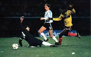 Ecuadorian striker Lupo Quiñónez in the away match against Argentina in 1983, where he scored the opening goal. The match ended 2–2. Ecuador did not advance from the strong group which also included Brazil.