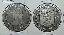 Peso was the name of the 8 real coins circulating in Ecuador since the Spanish colonial period. In 1856, the currency was pegged to the French franc, with 1 peso = 5 francs. From 1862, paper money was issued denominated in reales and pesos. The peso was formally adopted as the currency of Ecuador in 1871, replacing the real at a rate of 1 peso = 8 reales. It was subdivided into 100 centavos. In 1884, the peso was replaced by the sucre at par.