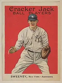 In 1908, Sweeney made his major league debut for the New York Highlanders of the American League on May 16. At the age of 19, he was the fourth-youngest player in the American League that season.[8] When Kid Elberfeld became the Highlander's manager during the season, he increased Sweeney's playing time.[9] Sweeney had a .146 batting average in 32 games played for the Highlanders in the 1908 season.[10] In 1909, Sweeney batted .267 in 67 games.[11] He led all American League catchers with 20 errors committed.[12]