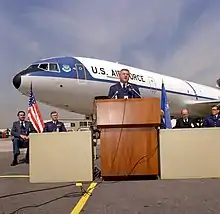 Lieutenant General speaks at the delivery ceremony for the new United States Air Force Tanker Aircraft, McDonnell-Douglas KC-10 Extender at McDonnell Douglas Corp. plant Headquarters in Berkeley, Missouri.