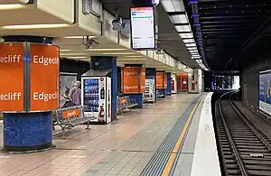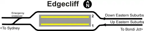 Edgecliff railway station is an underground commuter railway station located on the Eastern Suburbs line, serving the Sydney suburb of Edgecliff. It is served by Sydney Trains T4 Eastern Suburbs & Illawarra Line services and NSW TrainLink South Coast Line services.